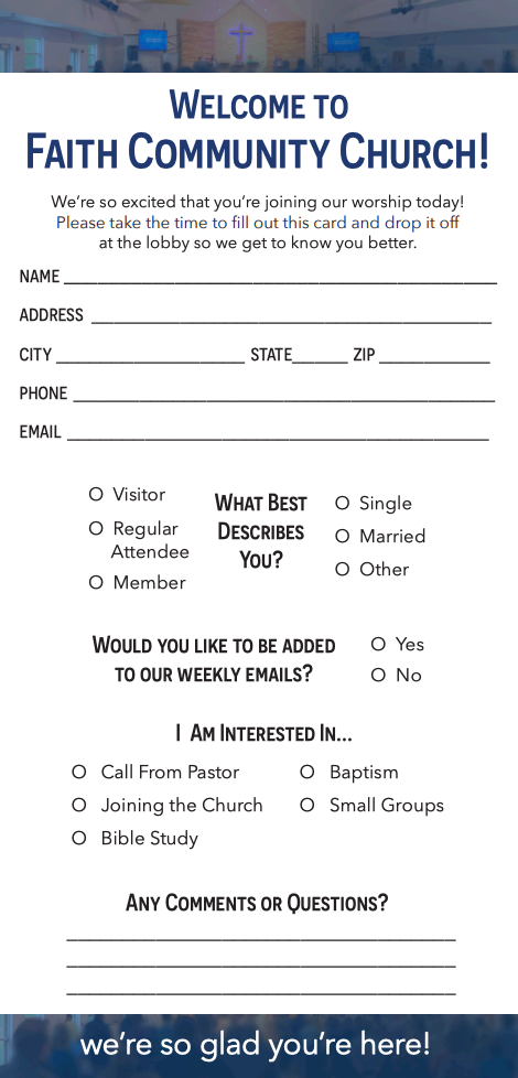 The welcome card lets the church connect with it’s members, first time guests, and the community.