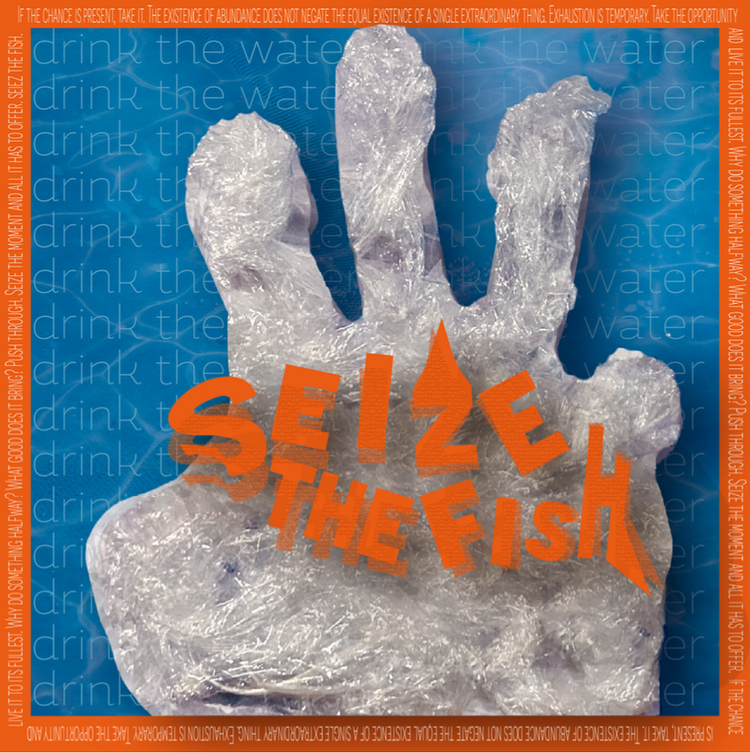 This iteration was created by adding plastic wrap to the physical poster, then cutting out the individual letters for “seize the fish”.