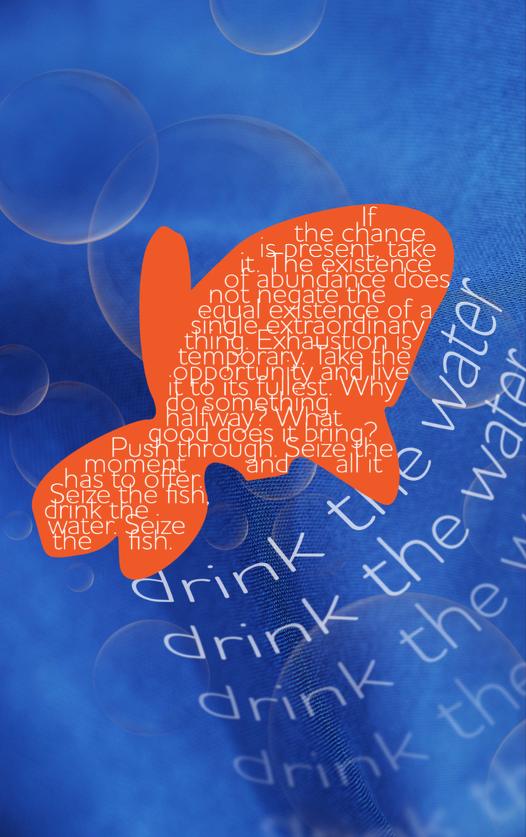 “Seize the fish, drink the water” is the result of a six word memoir prompt.