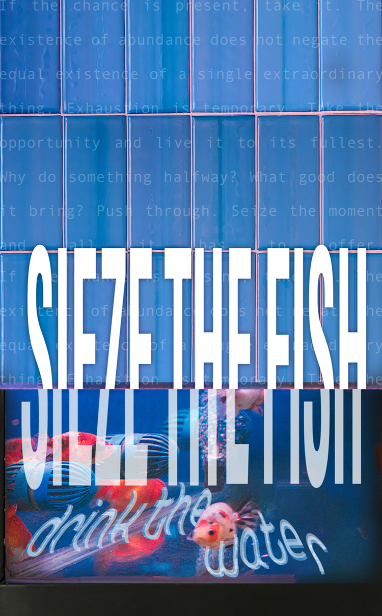 “Seize the fish” is half way submerged, leading to a refraction effect. This was done by expanding and splitting the letters.